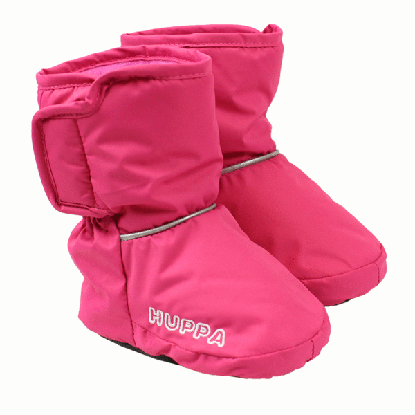 Babies’ soft waterproof and windproof lined booties. Breathable fabric. Cotton jersey inside. Reflective elements on fabric.