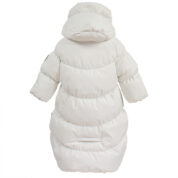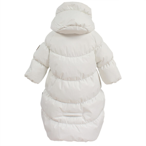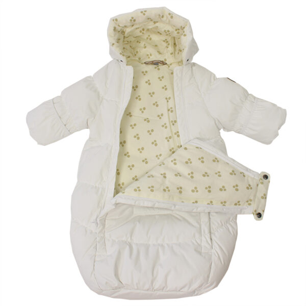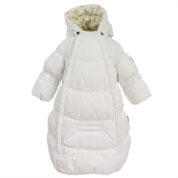 Waterproof and windproof babies’ sleeping bag. The sleeping bag is lined with soft cotton flannel and has breathable top fabric. It is easy to fit the baby into the sleeping bag thanks to the two full-length zippers, and for car rides, seat belts can conveniently be secured through the belt holes. Integrated elastic band at sleeve ends and around hood. The sleeve ends can easily be turned back and there is no need for gloves. Two long zippers at front.