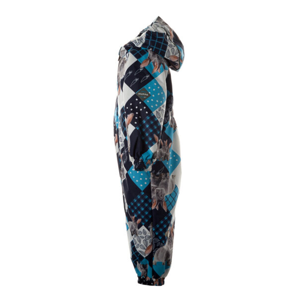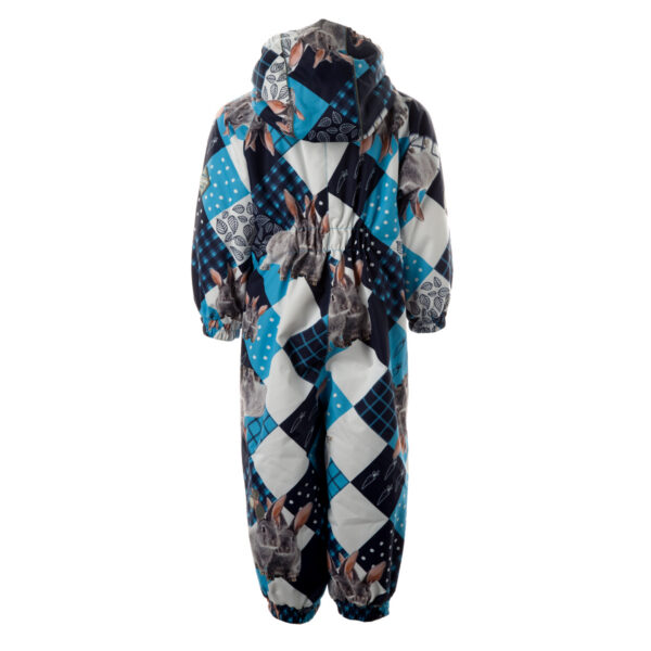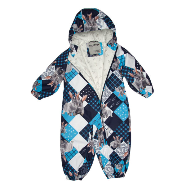Insulated (40 g) water- and windproof overall for babies, suitable for spring and autumn. The top layer of the overall is made of a breathable material. The overall has flannel lining, sewn-in elastic bands on the sleeves, leg ends and hood. Overalls in sizes 62-80 have retractable hand and leg coverings. The overall has taped seams. The set includes elastic foot straps. It is decorated with reflective details.