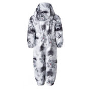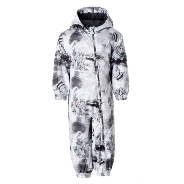 Insulated (40 g) water- and windproof overall for babies, suitable for spring and autumn. The top layer of the overall is made of a breathable material. The overall has flannel lining, sewn-in elastic bands on the sleeves, leg ends and hood. Overalls in sizes 62-80 have retractable hand and leg coverings. The overall has taped seams. The set includes elastic foot straps. It is decorated with reflective details.