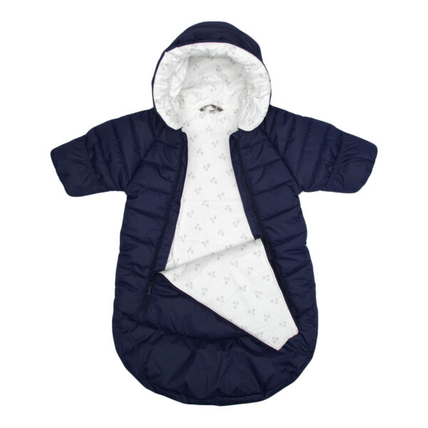 Mazuļu sildošs, ūdens un vēja necaurlaidīgs guļammaiss-kombinezons Gaisu caurlaidīgs virsējais audums Guļammaisa odere no flaneļa Piedurknēs un kapuces malā iestrādāta gumijas apdare Ērti atlokāmas piedurknes Radot dizainu ir padomāts arī par bērna drošību auto, jo drošības jostas atveres atrodas mugurpusē – tas nodrošina to, lai bērns netiktu nedrošā veidā piestiprināts ar drošības jostām Drošības jostu siksnas nedrīkst likt pāri virsdrēbēm, jo tad bērns nebūs kārtīgi piestiprināts Brauciens ar auto ir ne tikai drošs, bet arī ērts, jo bērnam nebūs karsti – guļammaisu-kombinezonu var ērti atvērt, drošības jostas piesprādēt virs pirmās drēbju kārtas un, ja nepieciešams doties ārā atkārtoti, tad var ātri uzvilkt kombinezonu