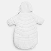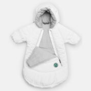 Waterproof and windproof sleeping bag. Breathable fabric. Flannel lining on the inside. Integrated elastic band at sleeve ends and around hood. Sleeve ends can be conveniently rolled down. The design also keeps in mind the safety of the child in the car – the product has safety belt holes on the back to ensure that the child is secured safely in the car seat. Car seat straps should not be buckled up over outer garments as this prevents from ensuring a tight fit. The sleeping bag-overall is a good choice for car rides – the child will not get hot in the car because the overall can easily be opened. Car seat straps should be buckled up over indoor clothing and the overall can be closed up again to go outside.