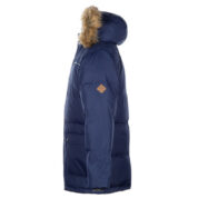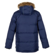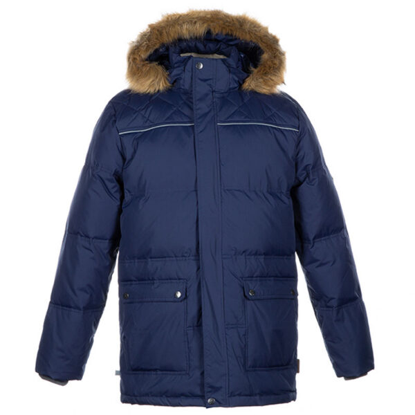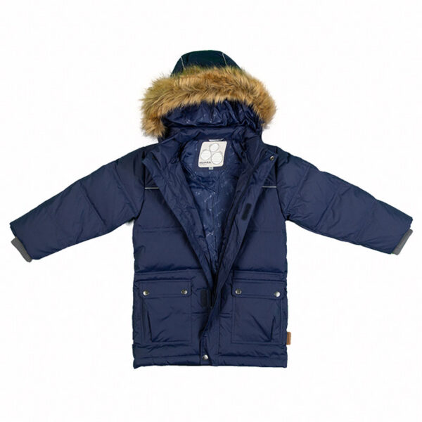 Boys´ down parka. The parka´s outer fabric is wind and water resistant and has a taffeta lining. The parka is filled with 50% feather and 50% down. Ribbed inner cuffs in the sleeves and an adjustable waist keep you warm and dry. The outer fabric has reflective details. The removable hood is attached to the collar with snaps and its natural fur trim is also removable. The parka´s zipper opens from both the top and bottom, and the pockets have a zipper and snaps.