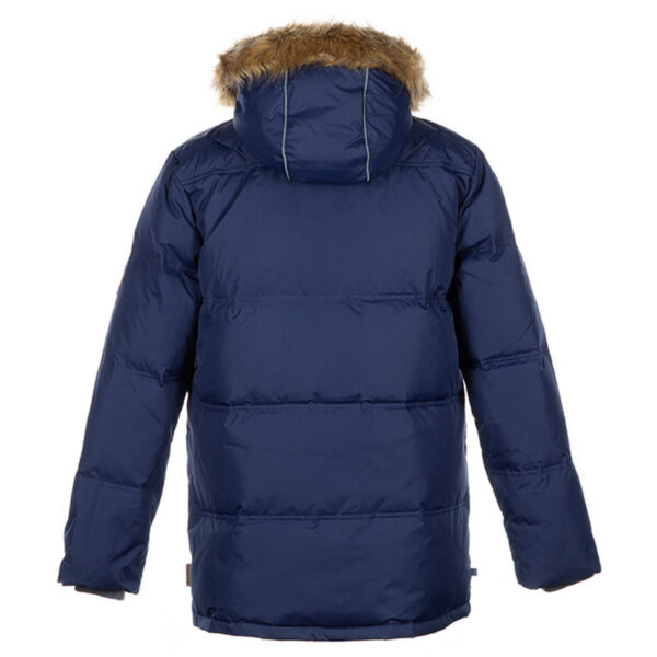 Men´s down parka. The parka´s outer fabric is wind and water resistant and has a taffeta lining. The parka is filled with 50% feather and 50% down. Ribbed inner cuffs in the sleeves and an adjustable waist keep you warm and dry. The outer fabric has reflective details. The removable hood is attached to the collar with snaps and its natural fur trim is also removable. The parka´s zipper opens from both the top and bottom, and the pockets have a zipper and snaps.