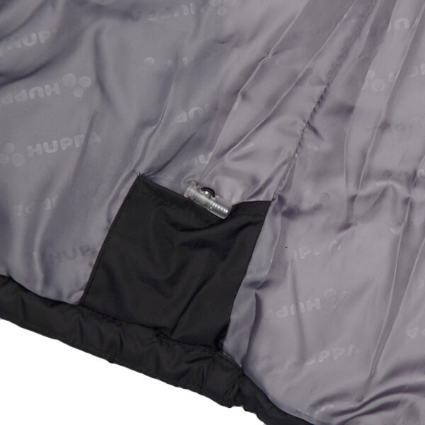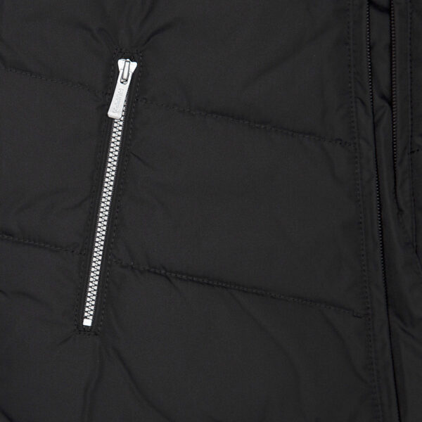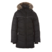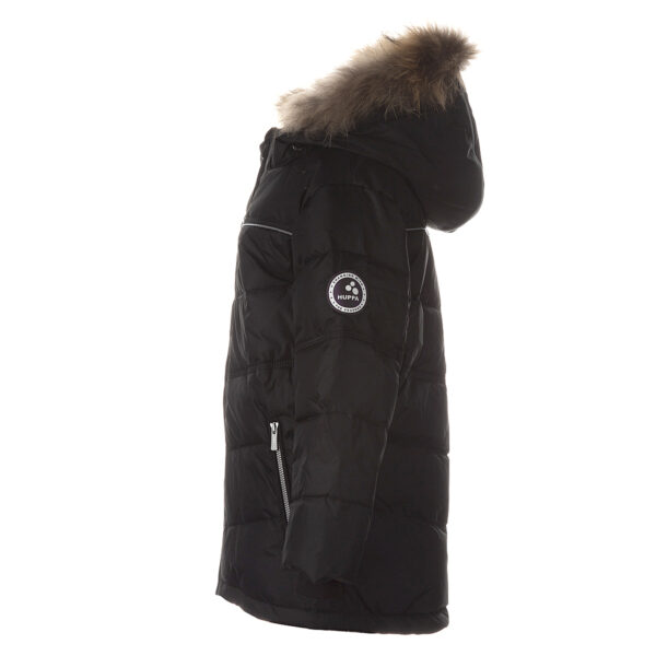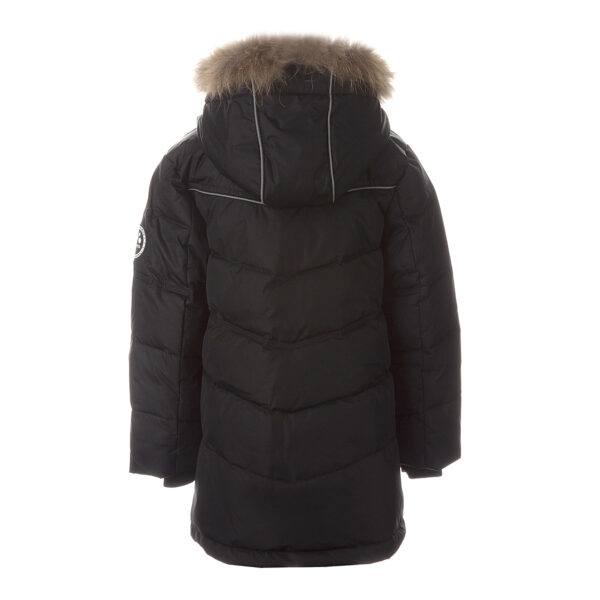 Children’s waterproof and windproof down jacket. Breathable fabric. Soft mesh lining on the inside. Down feathers and feathers for filling. Removable snap-on hood. Ribbed cuffs at sleeve ends. With zipper. Integrated zipper pockets at front. Removable natural fur trim on hood. Reflective elements on fabric.