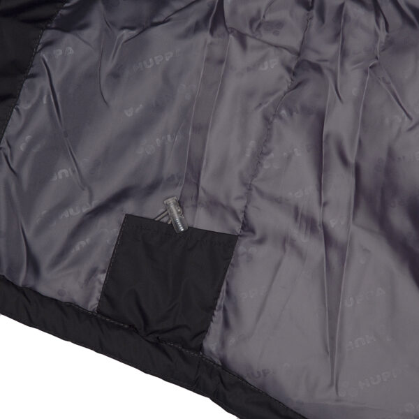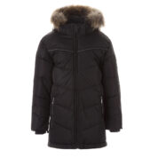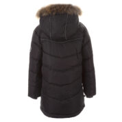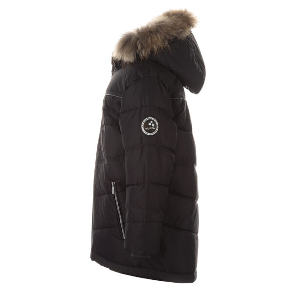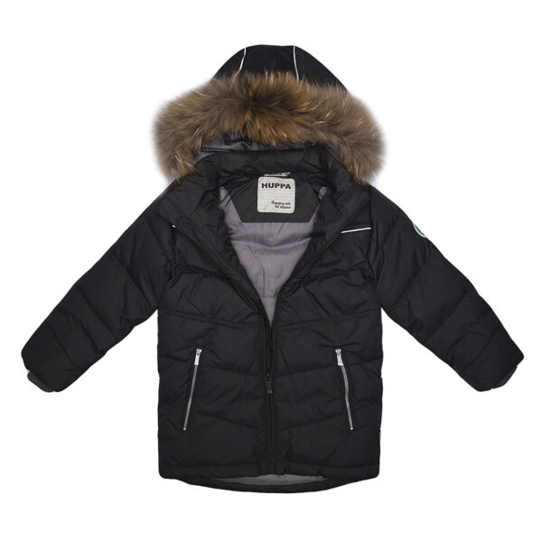 Children’s waterproof and windproof down jacket. Breathable fabric. Soft mesh lining on the inside. Down feathers and feathers for filling. Removable snap-on hood. Ribbed cuffs at sleeve ends. With zipper. Integrated zipper pockets at front. Removable natural fur trim on hood. Reflective elements on fabric.
