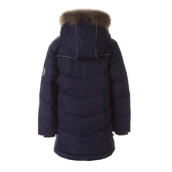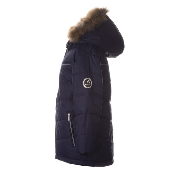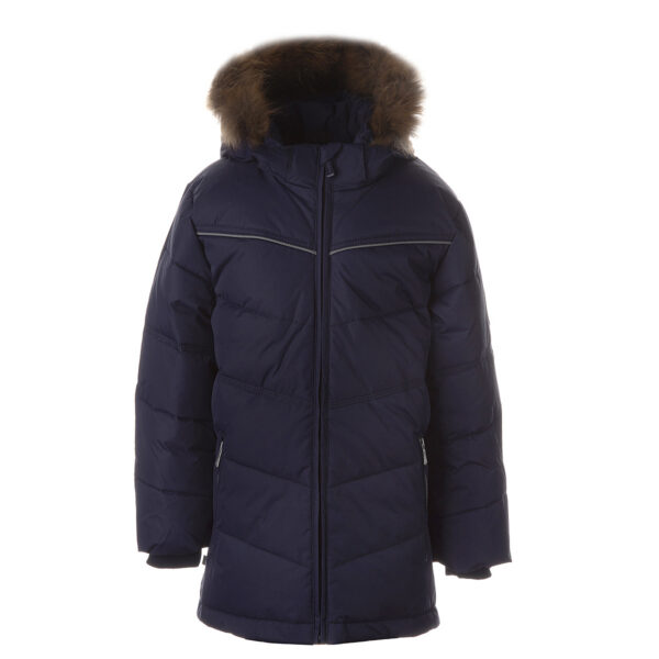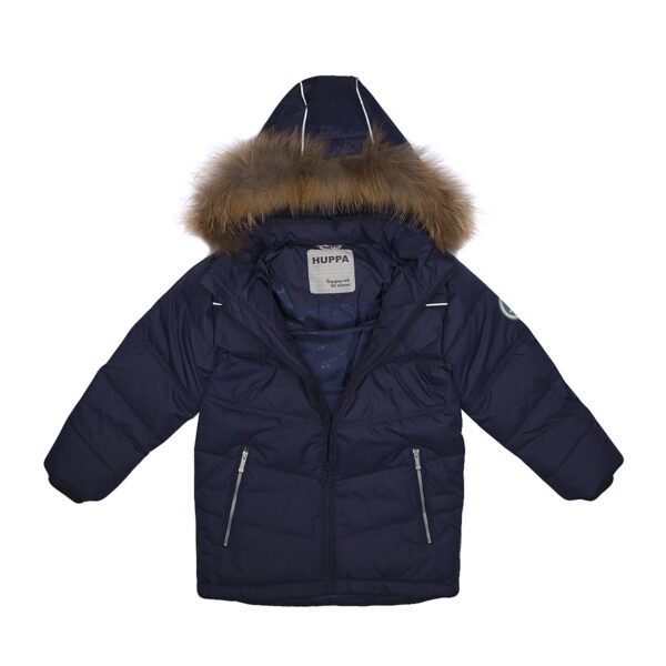 Children’s waterproof and windproof down jacket. Breathable fabric. Soft mesh lining on the inside. Down feathers and feathers for filling. Removable snap-on hood. Ribbed cuffs at sleeve ends. With zipper. Integrated zipper pockets at front. Removable natural fur trim on hood. Reflective elements on fabric.