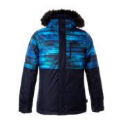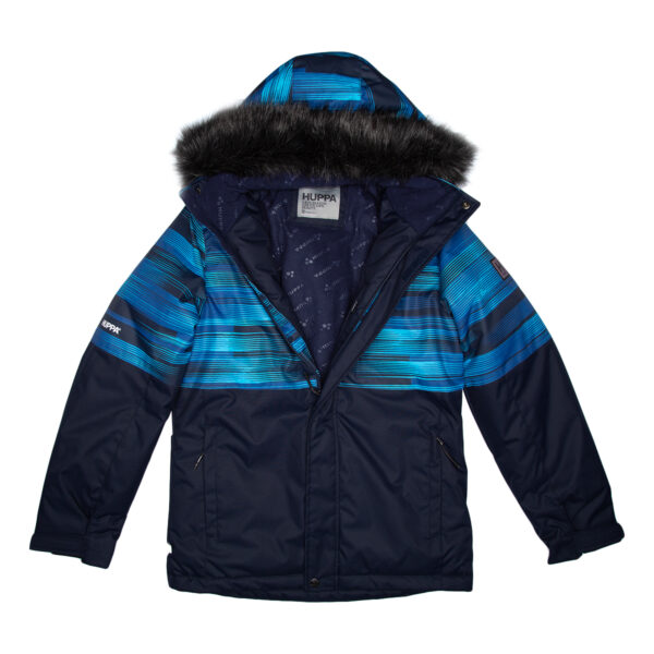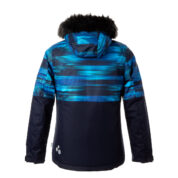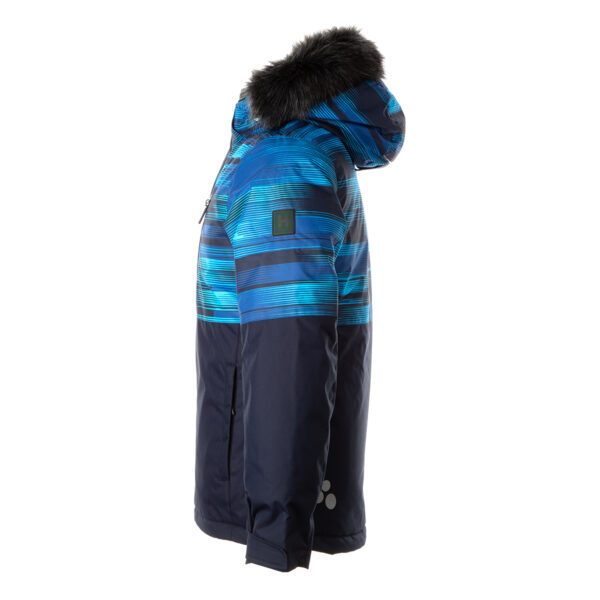 Children’s water- and windproof jacket with 200 g insulation. Breathable outer fabric. Soft lining fabric inside the jacket. Detachable hood fastens to the collar with snap buttons. Adjustable sleeve cuffs. Front zipper with placket. Front zipper pockets. Waterproof taped seams. Detachable faux fur trim on hood. Reflective detailing on outer fabric.