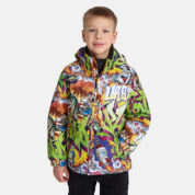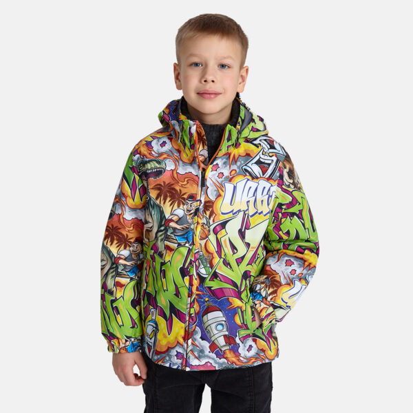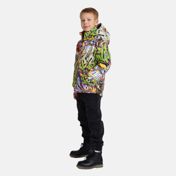 Insulated (40 g) water- and windproof jacket for boys, suitable for spring and autumn. The top layer of the jacket is made of a breathable material. The detachable hood can be attached to the collar with snap fasteners. The jacket has elasticated sleeve cuffs and hood. It is decorated with reflective details.