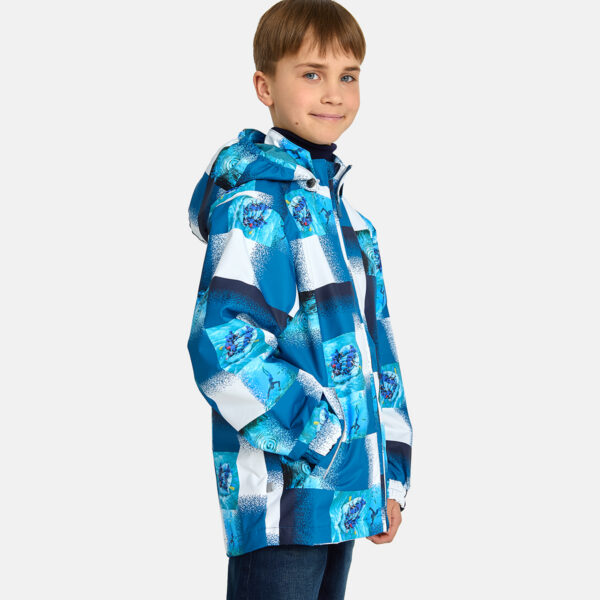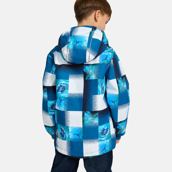 Insulated (40 g) water- and windproof jacket for boys, suitable for spring and autumn. The top layer of the jacket is made of a breathable material. The detachable hood can be attached to the collar with snap fasteners. The jacket has elasticated sleeve cuffs and hood. It is decorated with reflective details.