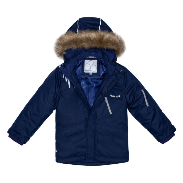 Boys´ winter jacket with 300g insulation. Wind and water resistant fabric with the best technical characteristics. Taped seams, ribbed inner cuffs in the sleeves, adjustable sleeve ends and an adjustable hem keep you warm and dry even when doing winter sports. For the best visibility in the dark, the jacket has been added with reflective details and the front of the chest is decorated with a reflective application. The removable hood is safe – it is fastened with snaps to prevent getting caught and its furry edge is also removable. The jacket has front pockets and a chest and shoulder pocket, all equipped with a zipper.