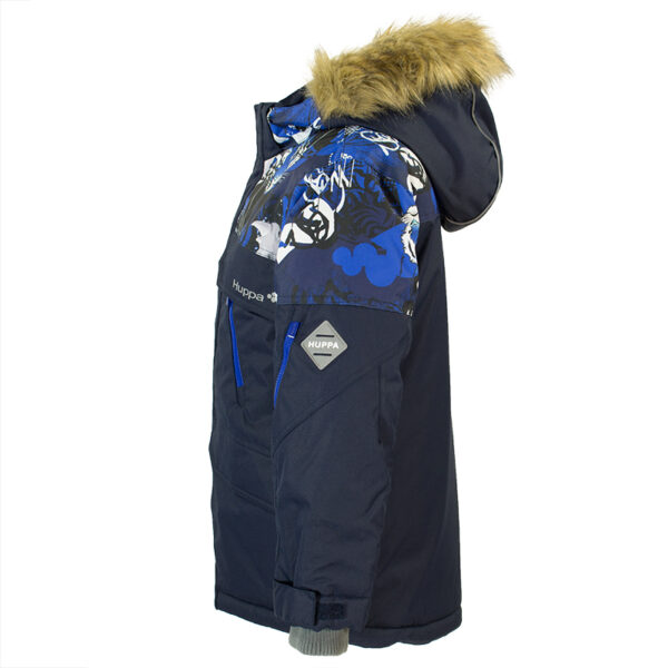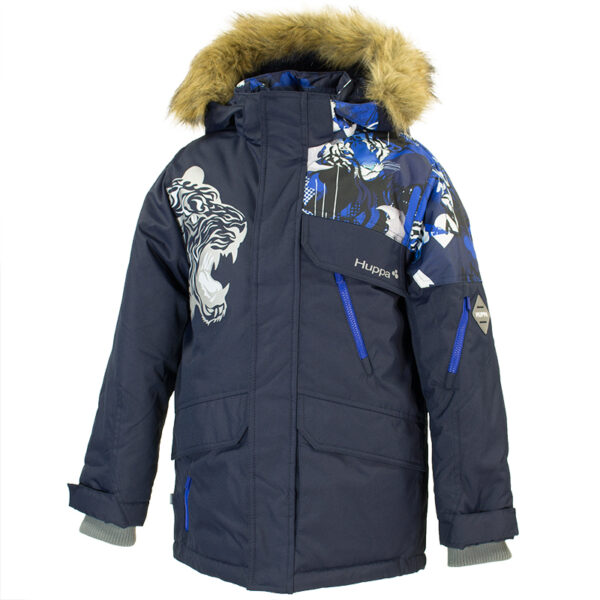 Boys´ winter jacket with 300g insulation. Wind and water resistant fabric with the best technical characteristics. Taped seams, ribbed inner cuffs in the sleeves, adjustable sleeve ends and an adjustable hem keep you warm and dry even when doing winter sports. For the best visibility in the dark, the jacket has been added with reflective details and the front of the chest is decorated with a reflective application. The removable hood is safe – it is fastened with snaps to prevent getting caught and its furry edge is also removable. The jacket has front pockets and a chest and shoulder pocket, all equipped with a zipper.
