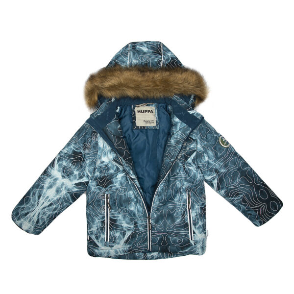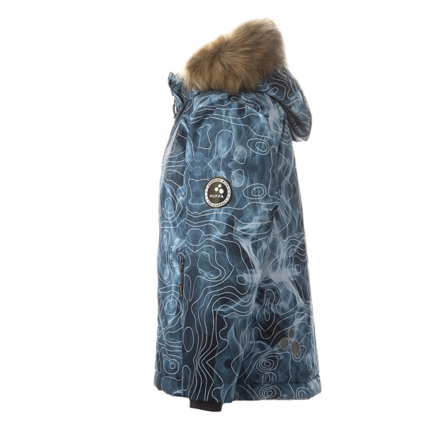 Boys´ winter jacket. Wind- and waterproof outer fabric and its insulation is 300g. For best visibility in the dark, the jacket has been equipped with reflective details. The ribbed inner cuffs on the sleeves keep the child warm and dry. The removable hood is safe – it is fastened with snaps to prevent it from getting caught, and its fur trim is also removable. The front pockets of the jacket are equipped with zippers.