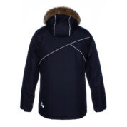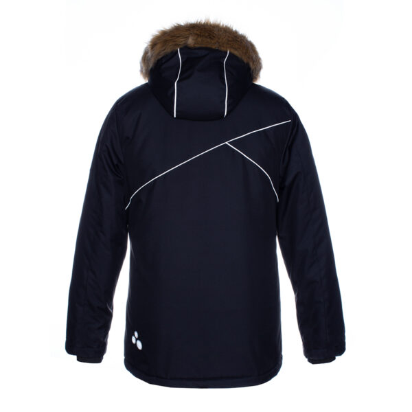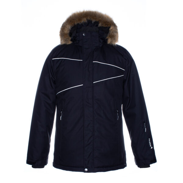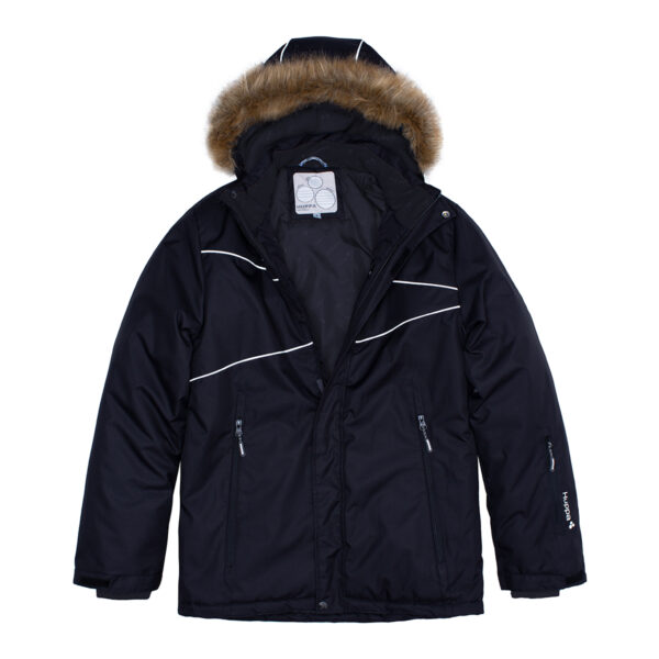 Children’s waterproof and windproof jacket. Breathable fabric. Soft mesh lining on the inside. Removable snap-on hood. Ribbed cuffs at sleeve ends. Adjustable sleeve ends. Lapped zipper at front Integrated zipper pockets at front. Waterproof taped seams. Removable faux fur trim on hood. Reflective elements on fabric.