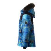 Children’s waterproof and windproof jacket. Breathable fabric. Soft mesh lining on the inside. Removable snap-on hood. Ribbed cuffs at sleeve ends. Adjustable sleeve ends. Lapped zipper at front Integrated zipper pockets at front. Waterproof taped seams. Removable faux fur trim on hood. Reflective elements on fabric.