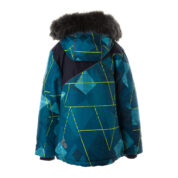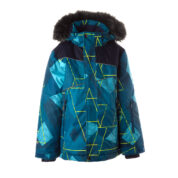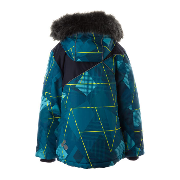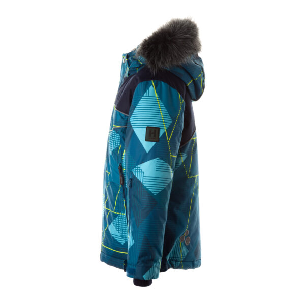 Children’s waterproof and windproof jacket. Breathable fabric. Soft mesh lining on the inside. Removable snap-on hood. Ribbed cuffs at sleeve ends. Adjustable sleeve ends. Lapped zipper at front Integrated zipper pockets at front. Waterproof taped seams. Removable faux fur trim on hood. Reflective elements on fabric.