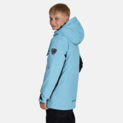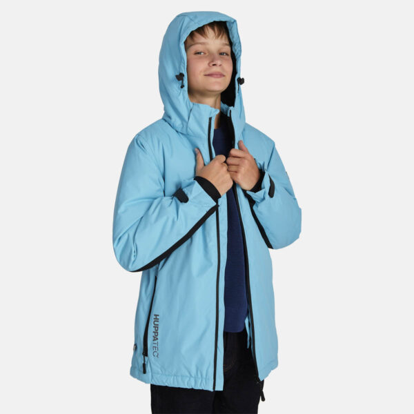 Children’s waterproof and windproof jacket. Breathable fabric. Soft mesh lining on the inside. Integrated adjustable elastic band around the hood and on the back. Waterproof zipper at front, zippered pockets. Adjustable sleeve ends. Cuffs with thumb holes at sleeve ends. Waterproof taped seams. Reflective elements on fabric.