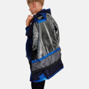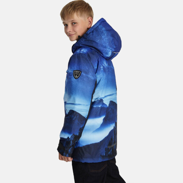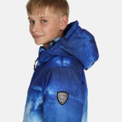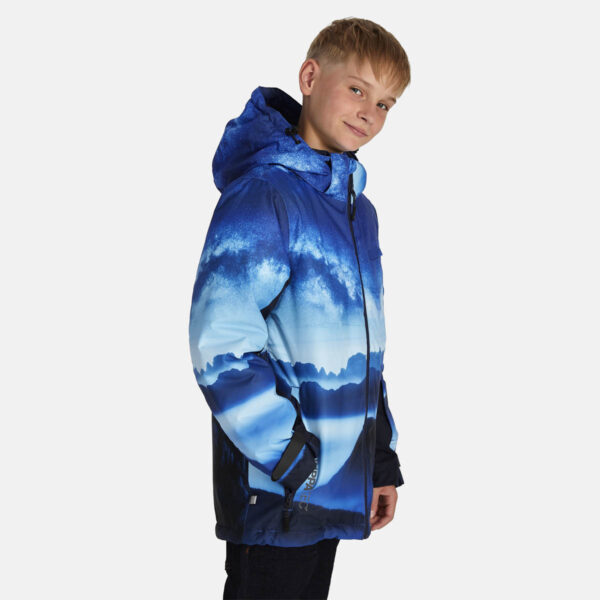Children’s waterproof and windproof jacket. Breathable fabric. Soft mesh lining on the inside. Integrated adjustable elastic band around the hood and on the back. Waterproof zipper at front, zippered pockets. Adjustable sleeve ends. Cuffs with thumb holes at sleeve ends. Waterproof taped seams. Reflective elements on fabric.