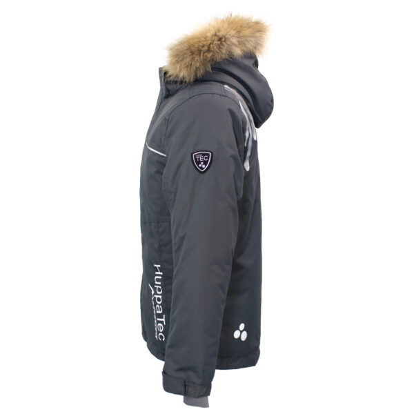 The boys´ waterproof and highly durable HuppaTec jacket with 200 g insulation. All seams of the jacket are taped and its heat-reflecting HuppaTec lining ensures 30% better thermal insulation for the product. Thanks to this lining, thin intermediate layers can be used when dressing, which makes active movement without sweating much more pleasant and the body stays warm and dry even in urgent situations. The comfort of use is increased by elastic cuffs, an easily removable hood with buttons and a genuine fur trim, a snow guard, zipped pockets and a smart card pocket. Reflective details add safety