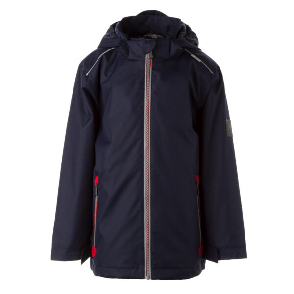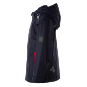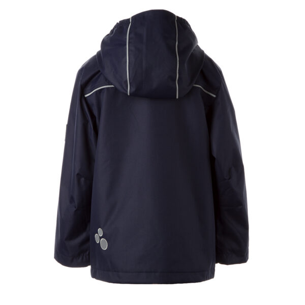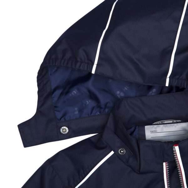 Children´s waterproof and windproof spring-autumn jacket. Breathable outer fabric. Rubber band incorporated at the edge of the hood. The removable hood attaches to the collar with press studs. Adjustable sleeve ends. Zipper fastener. Incorporated pockets on the front. Rubber band tunnel with stoppers incorporated at the bottom. Reflective details on the outer fabric.