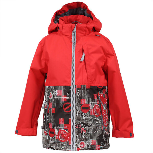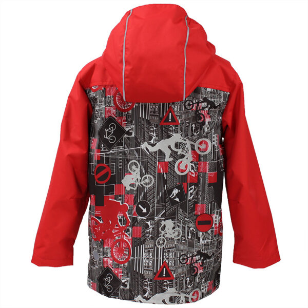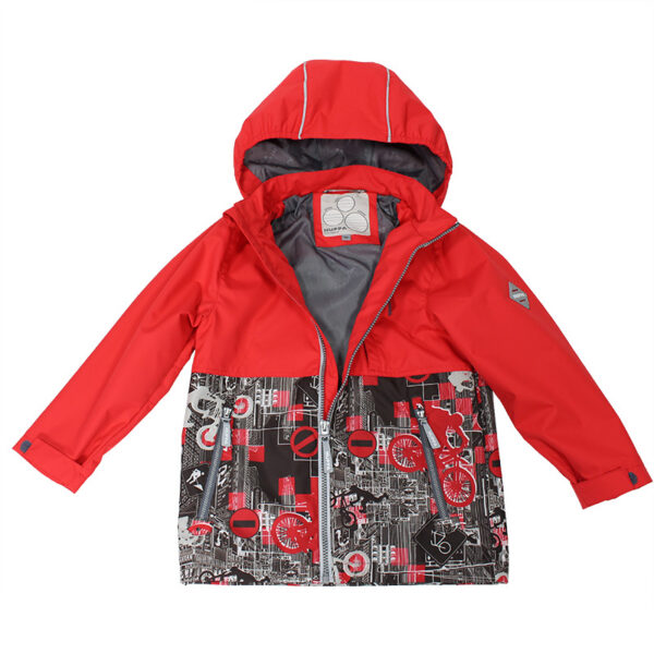 Boys´ spring-autumn jacket without insulation. The jacket with playful cutouts has a light taffeta lining, which makes it easier to put on the jacket, allowing your hand to easily slip through the sleeve. For more comfortable wearing, the jacket has a removable hood with snaps and adjustable sleeve cuffs with Velcro. For safer wearing, the jacket has reflective details in the cutouts of the hood, cool Huppa logo balls on the lower back and a special loop for hanging a reflector on the right side.