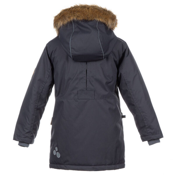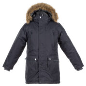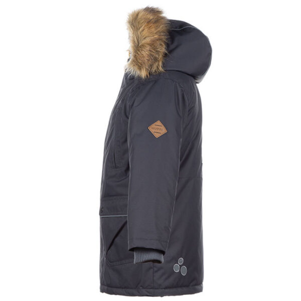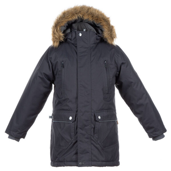 Boys´ parka with 300 g insulation. The outer fabric is wind- and waterproof. Taped seams, ribbed inner cuffs in the sleeves and an adjustable waist and hem keep you warm and dry. Reflective details on the outer fabric. The removable hood is attached to the collar with snaps and its natural fur trim is also removable. The parka has zippered chest pockets and snap-fastened front pockets.