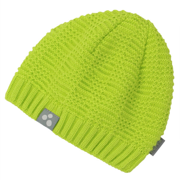 A knitted hat for boys. The hat is knitted from 50% acrylic yarn and 50% merino wool. The double ribbed hem protects the ears from the cold wind.