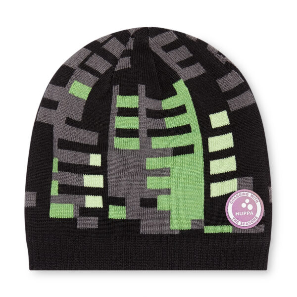 Children’s merino wool knit hat. Cotton jersey on the inside. Reflective Huppa logo.