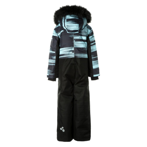 Children’s waterproof and windproof overall. Breathable fabric. Soft lining fabric on the inside. Removable snap-on hood. Integrated adjustable elastic band around the hood and on the back. Ribbed cuffs at sleeve ends. Adjustable sleeve ends. Lapped zipper at front. Integrated zipper pockets at front. Buttonhole-adjustable waist. Durable Cordura fabric legs. Snow gaiters at leg ends. Drawstring tunnel with stoppers at leg ends. Waterproof taped seams. Removable faux fur trim on hood. Reflective elements on fabric.