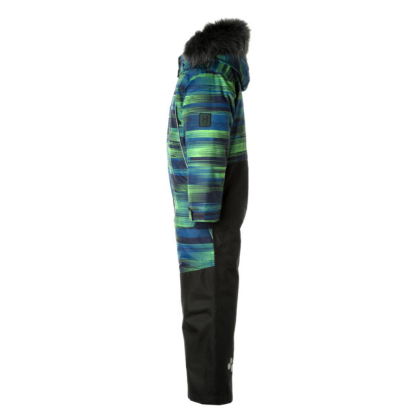 Children’s waterproof and windproof overall. Breathable fabric. Soft lining fabric on the inside. Removable snap-on hood. Integrated adjustable elastic band around the hood and on the back. Ribbed cuffs at sleeve ends. Adjustable sleeve ends. Lapped zipper at front. Integrated zipper pockets at front. Buttonhole-adjustable waist. Durable Cordura fabric legs. Snow gaiters at leg ends. Drawstring tunnel with stoppers at leg ends. Waterproof taped seams. Removable faux fur trim on hood. Reflective elements on fabric.