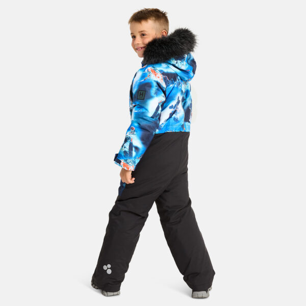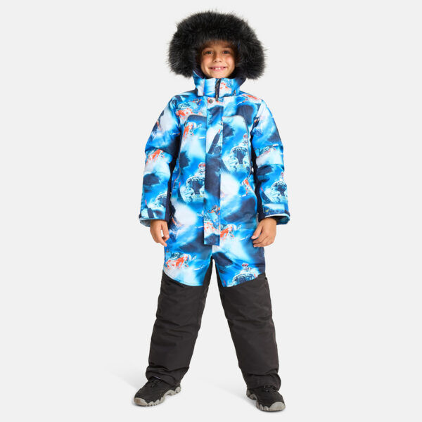 Children’s waterproof and windproof overall. Breathable fabric. Soft lining fabric on the inside. Removable snap-on hood. Integrated adjustable elastic band around the hood and on the back. Ribbed cuffs at sleeve ends. Adjustable sleeve ends. Lapped zipper at front. Integrated zipper pockets at front. Buttonhole-adjustable waist. Durable Cordura fabric legs. Snow gaiters at leg ends. Drawstring tunnel with stoppers at leg ends. Waterproof taped seams. Removable faux fur trim on hood. Reflective elements on fabric.