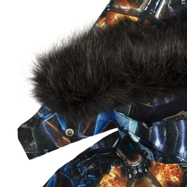 Children’s waterproof and windproof overall. Breathable fabric. Soft lining fabric on the inside. Removable snap-on hood. Integrated adjustable elastic band around the hood and on the back. Ribbed cuffs at sleeve ends. Adjustable sleeve ends. Lapped zipper at front. Integrated zipper pockets at front. Buttonhole-adjustable waist. Durable Cordura fabric legs. Snow gaiters at leg ends. Drawstring tunnel with stoppers at leg ends. Waterproof taped seams. Removable faux fur trim on hood. Reflective elements on fabric.