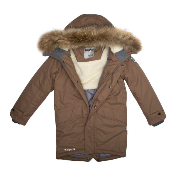 Boys´ waterproof and windproof winter parka. Breathable fabric. Soft fabric on the inside. Faux sheepskin lining at the top of the back and inside the hood. Adjustable hood. Ribbed cuffs at sleeve ends. Adjustable sleeve ends. Two-way zipper covered with press button flap at front. Drawstring tunnel with stoppers on waist. Waterproof taped seams. Removable natural fur trim on hood. Reflective elements on fabric.