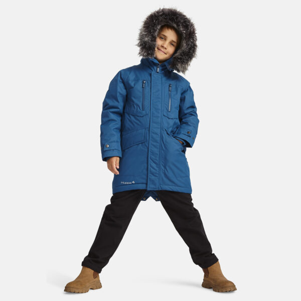 Boys´ waterproof and windproof winter parka. Breathable fabric. Soft fabric on the inside. Faux sheepskin lining at the top of the back and inside the hood. Adjustable hood. Ribbed cuffs at sleeve ends. Adjustable sleeve ends. Two-way zipper covered with press button flap at front. Drawstring tunnel with stoppers on waist. Waterproof taped seams. Removable faux fur trim on hood. Reflective elements on fabric.