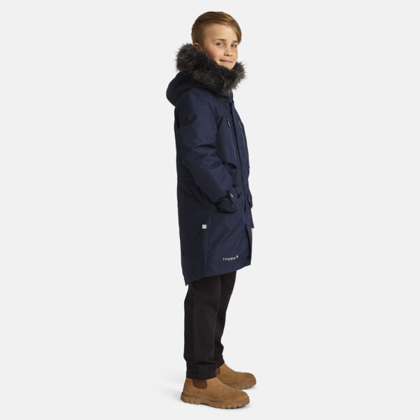 Boys´ waterproof and windproof winter parka. Breathable fabric. Soft fabric on the inside. Faux sheepskin lining at the top of the back and inside the hood. Adjustable hood. Ribbed cuffs at sleeve ends. Adjustable sleeve ends. Two-way zipper covered with press button flap at front. Drawstring tunnel with stoppers on waist. Waterproof taped seams. Removable faux fur trim on hood. Reflective elements on fabric.