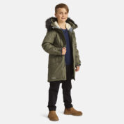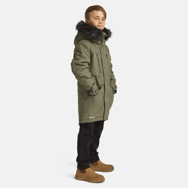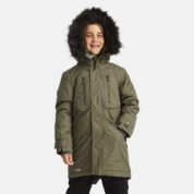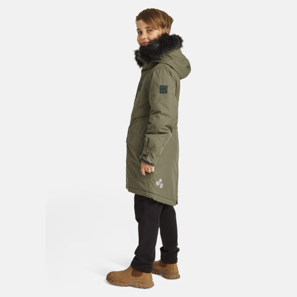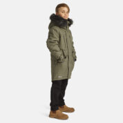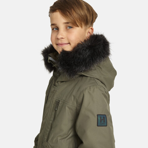 Bērnu ūdens un vēja necaurlaidīgā ziemas jaka Gaisu caurlaidīgs virsējais audums Jakas odere no mīksta auduma Muguras augšdaļā un kapuces iekšējos sānos jērādas imitācijas odere Regulējama kapuce Rievota piedurkņu apdare Regulējamas piedurknes Priekšpusē apšūts dubultā virziena rāvējslēdzējs Vidukļa daļā rāvējslēdzējs ar stoperi Ūdens necaurlaidīgi līmēti izšuvumi Kapucei noņemama mākslīgās kažokādas mala Auduma virspusē atstarojošas detaļas