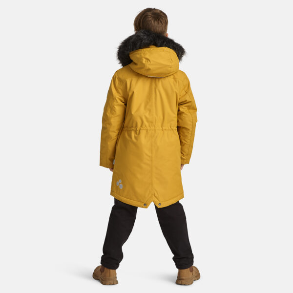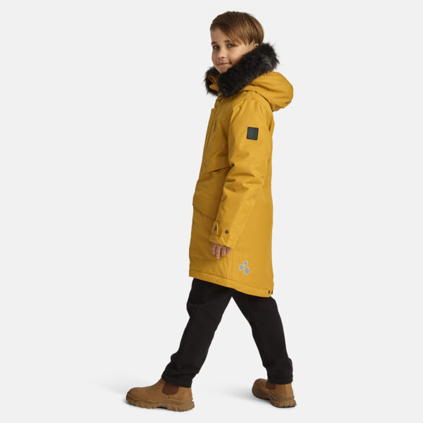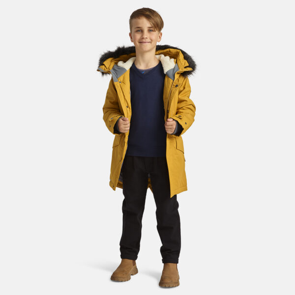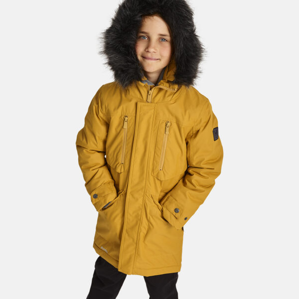 Boys´ waterproof and windproof winter parka. Breathable fabric. Soft fabric on the inside. Faux sheepskin lining at the top of the back and inside the hood. Adjustable hood. Ribbed cuffs at sleeve ends. Adjustable sleeve ends. Two-way zipper covered with press button flap at front. Drawstring tunnel with stoppers on waist. Waterproof taped seams. Removable faux fur trim on hood. Reflective elements on fabric.