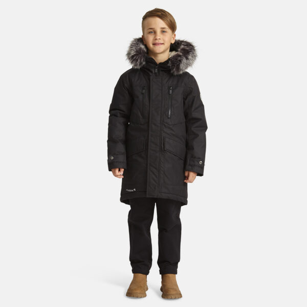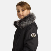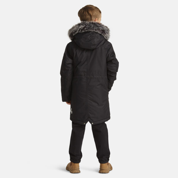 Boys´ waterproof and windproof winter parka. Breathable fabric. Soft fabric on the inside. Faux sheepskin lining at the top of the back and inside the hood. Adjustable hood. Ribbed cuffs at sleeve ends. Adjustable sleeve ends. Two-way zipper covered with press button flap at front. Drawstring tunnel with stoppers on waist. Waterproof taped seams. Removable faux fur trim on hood. Reflective elements on fabric.