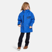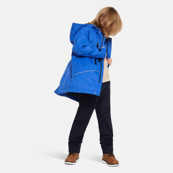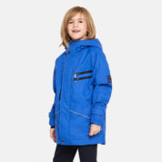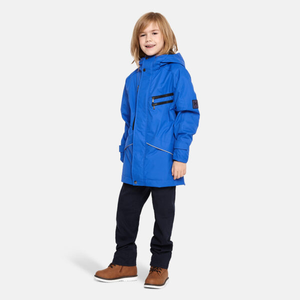 Insulated (40 g) water- and windproof parka for boys, suitable for spring and autumn. The top layer of the parka is made of a breathable material. It has an adjustable hood and ribbed sleeve cuffs. Integrated breast pockets with waterproof zippers. The parka also has waterproof, taped seams and is decorated with reflective details.