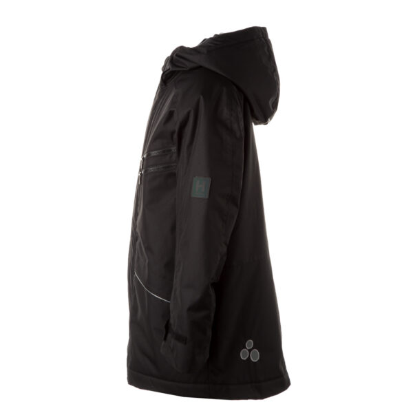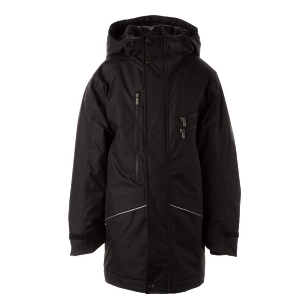 Insulated (40 g) water- and windproof parka for boys, suitable for spring and autumn. The top layer of the parka is made of a breathable material. It has an adjustable hood and ribbed sleeve cuffs. Integrated breast pockets with waterproof zippers. The parka also has waterproof, taped seams and is decorated with reflective details.