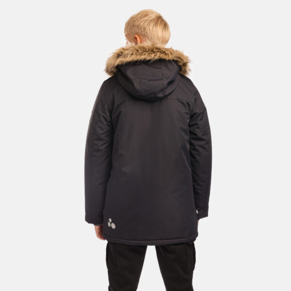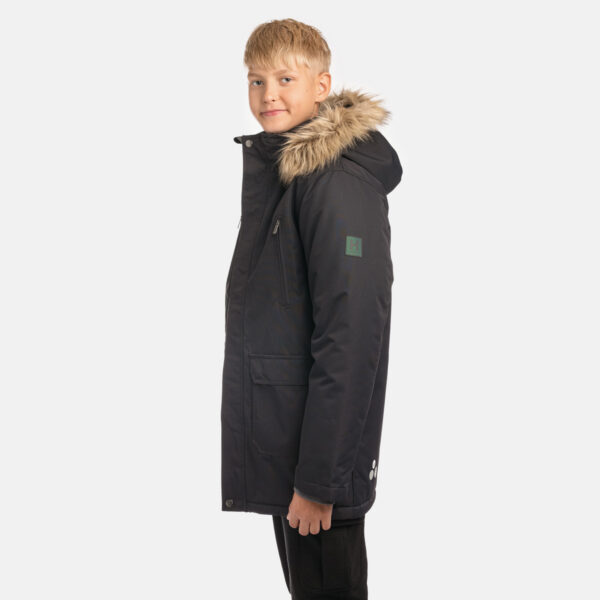 Boys’ water- and windproof winter parka with 300 g insulation. Breathable outer fabric. Detachable hood fastens to the collar with snap buttons. Ribbed cuffs on sleeves. Waterproof taped seams. Reflective detailing on outer fabric.