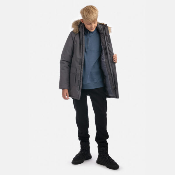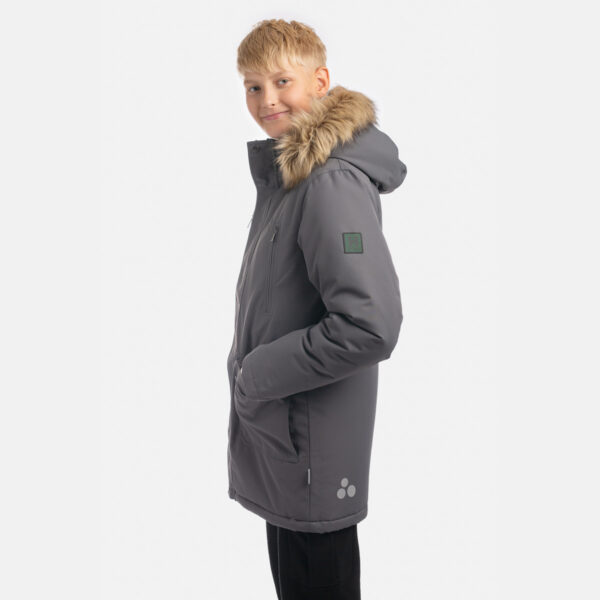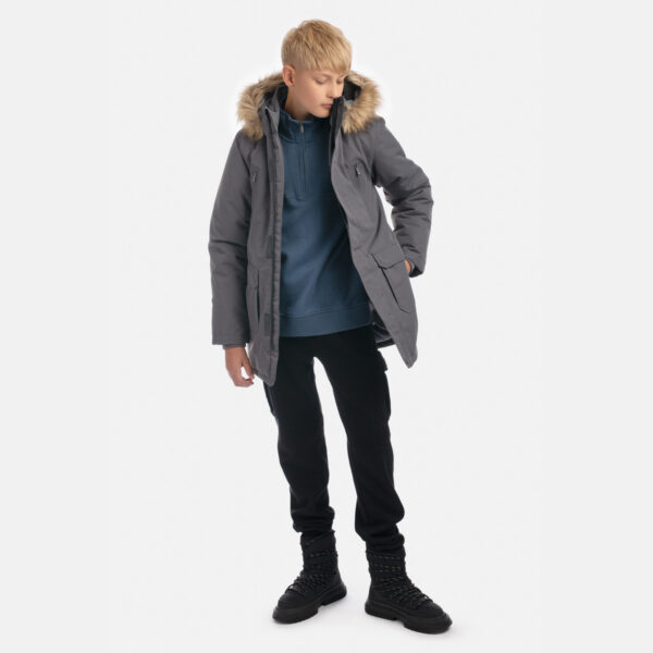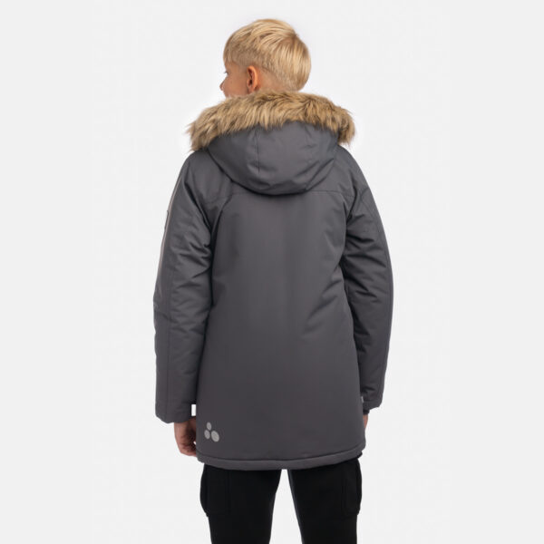 Boys’ water- and windproof winter parka with 300 g insulation. Breathable outer fabric. Detachable hood fastens to the collar with snap buttons. Ribbed cuffs on sleeves. Waterproof taped seams. Reflective detailing on outer fabric.