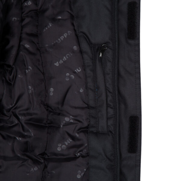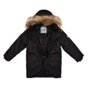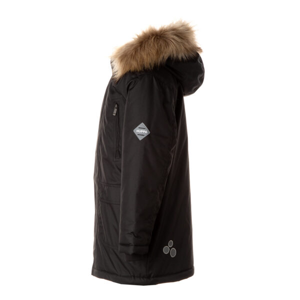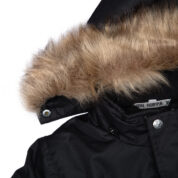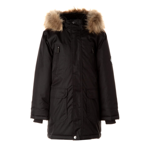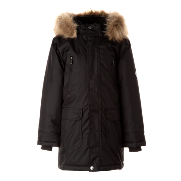 Boys’ water- and windproof winter parka with 300 g insulation. Breathable outer fabric. Detachable hood fastens to the collar with snap buttons. Ribbed cuffs on sleeves. Waterproof taped seams. Reflective detailing on outer fabric.