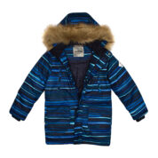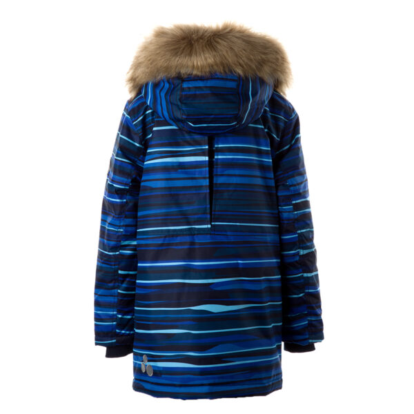 Children’s waterproof and windproof winter parka Breathable fabric Soft lining on the inside Removable snap-on hood Ribbed cuffs at sleeve ends Faux fur trim on hood Waterproof taped seams Reflective elements on fabric