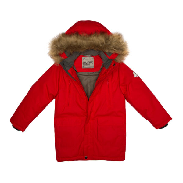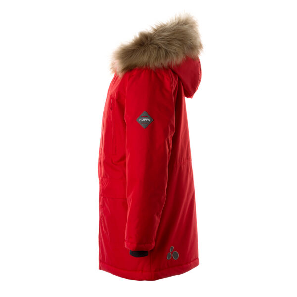Children’s waterproof and windproof winter parka Breathable fabric Soft lining on the inside Removable snap-on hood Ribbed cuffs at sleeve ends Faux fur trim on hood Waterproof taped seams Reflective elements on fabric