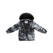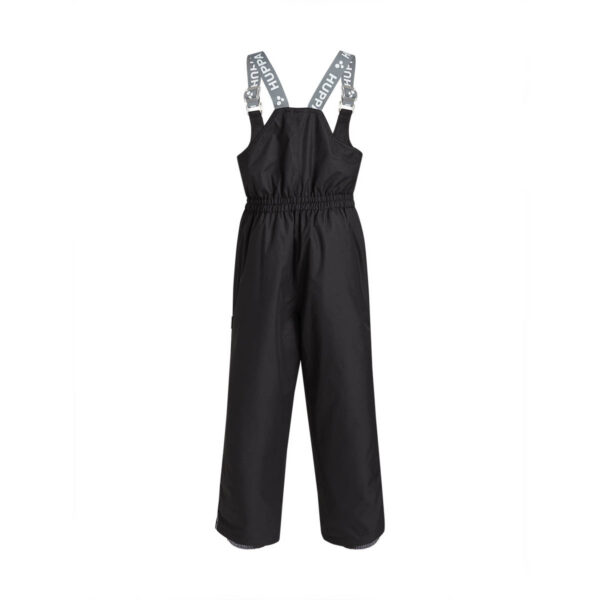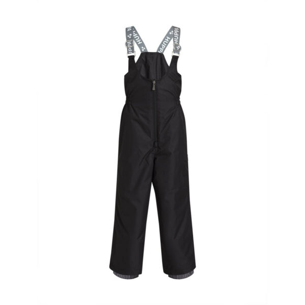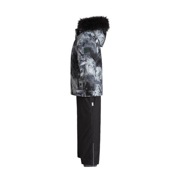 Children’s jacket and trousers set. Water- and windproof, breathable outer fabric. Inside of jacket and trousers in soft lining fabric. Elastic cuffs on ends of sleeves. Detachable hood fastens to the collar with snap buttons. Detachable faux fur trim on hood. Trousers have higher waist and adjustable elastic suspenders. Elastic waistband. Snow locks at leg ends. Rubber cord tunnel with stoppers at leg ends. Waterproof taped seams. Trousers have no inseam in leg part. Both jacket and trousers have reflective details.