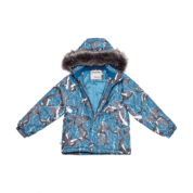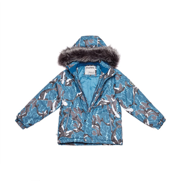 Children’s jacket and trousers set. Water- and windproof, breathable outer fabric. Inside of jacket and trousers in soft lining fabric. Elastic cuffs on ends of sleeves. Detachable hood fastens to the collar with snap buttons. Detachable faux fur trim on hood. Trousers have higher waist and adjustable elastic suspenders. Elastic waistband. Snow locks at leg ends. Rubber cord tunnel with stoppers at leg ends. Waterproof taped seams. Trousers have no inseam in leg part. Both jacket and trousers have reflective details.