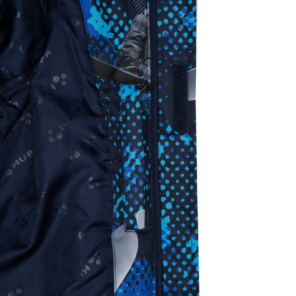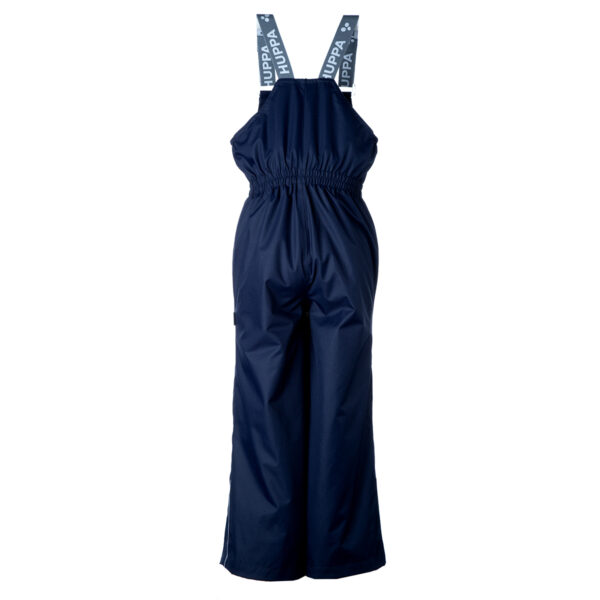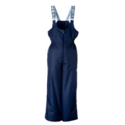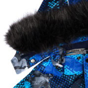 Children’s jacket and trousers set. Water- and windproof, breathable outer fabric. Inside of jacket and trousers in soft lining fabric. Elastic cuffs on ends of sleeves. Detachable hood fastens to the collar with snap buttons. Detachable faux fur trim on hood. Trousers have higher waist and adjustable elastic suspenders. Elastic waistband. Snow locks at leg ends. Rubber cord tunnel with stoppers at leg ends. Waterproof taped seams. Trousers have no inseam in leg part. Both jacket and trousers have reflective details.