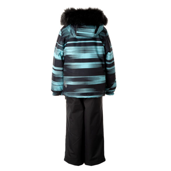 Children’s jacket and trousers set. Water- and windproof, breathable outer fabric. Inside of jacket and trousers in soft lining fabric. Elastic cuffs on ends of sleeves. Detachable hood fastens to the collar with snap buttons. Detachable faux fur trim on hood. Trousers have higher waist and adjustable elastic suspenders. Elastic waistband. Snow locks at leg ends. Rubber cord tunnel with stoppers at leg ends. Waterproof taped seams. Trousers have no inseam in leg part. Both jacket and trousers have reflective details.