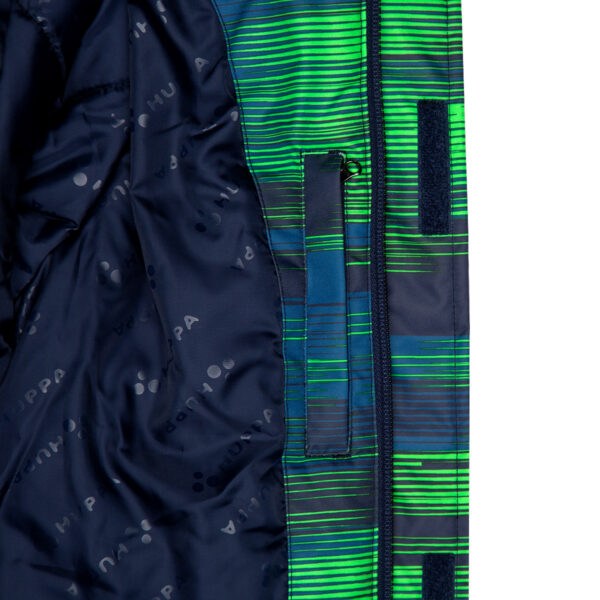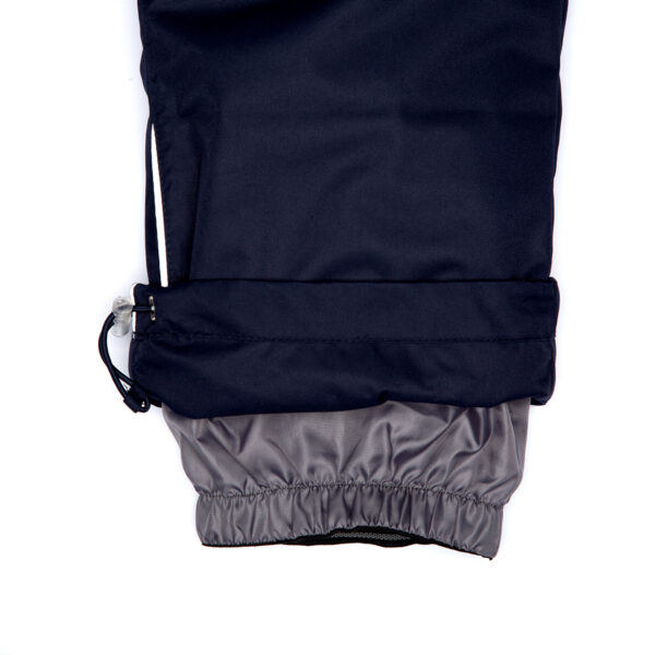 Children’s jacket and trousers set. Water- and windproof, breathable outer fabric. Inside of jacket and trousers in soft lining fabric. Elastic cuffs on ends of sleeves. Detachable hood fastens to the collar with snap buttons. Detachable faux fur trim on hood. Trousers have higher waist and adjustable elastic suspenders. Elastic waistband. Snow locks at leg ends. Rubber cord tunnel with stoppers at leg ends. Waterproof taped seams. Trousers have no inseam in leg part. Both jacket and trousers have reflective details.
